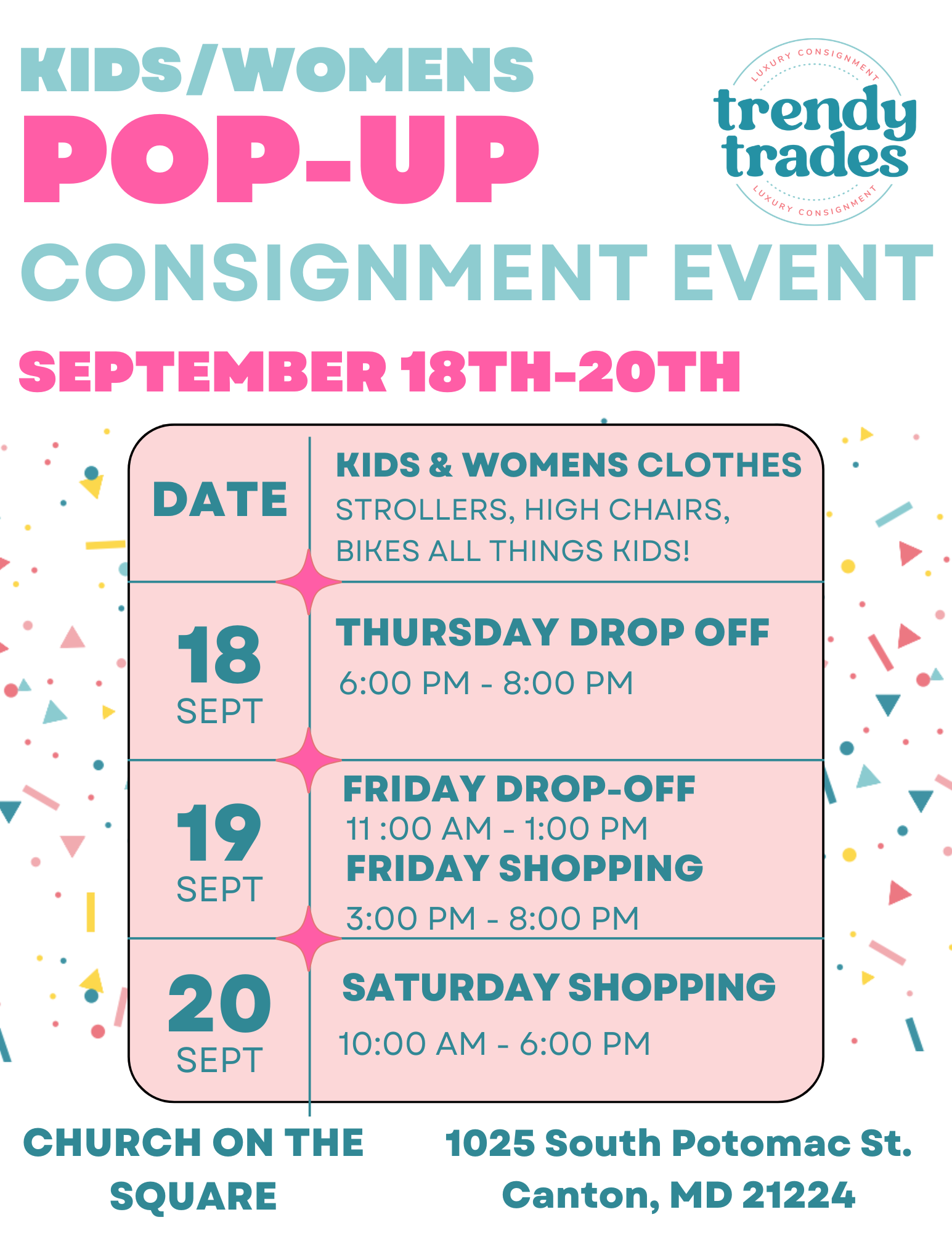 We’re thrilled to partner with Church on the Square in Canton, MD for this one-of-a-kind event! Whether you’re joining us to sell your best pieces or hunt for amazing deals, come join us for a great community event to sell kids and women’s high quality items.